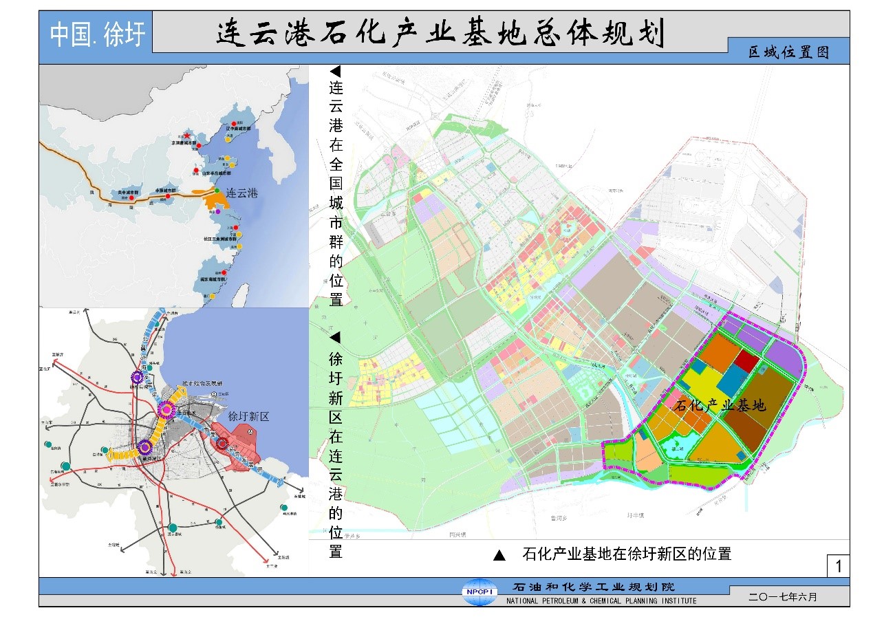 连云港石化产业基地,是全国七大石化产业基地之一,位于国家东中西产业合作示范基地(徐圩新区)(//www.xwxq.gov.cn/)。徐圩新区总规划面积约467平方公里,拥有194平方公里的工业建设用地,石化产业基地规划面积62.6平方公里。位于中国沿海经济带和陆桥经济带的交汇处,规划建设30万吨级深水航道和116个大中型泊位,一期10万吨级航道,10万吨级通用散货泊位和液体散货泊位已建成投运,30万吨级原油码头在建。