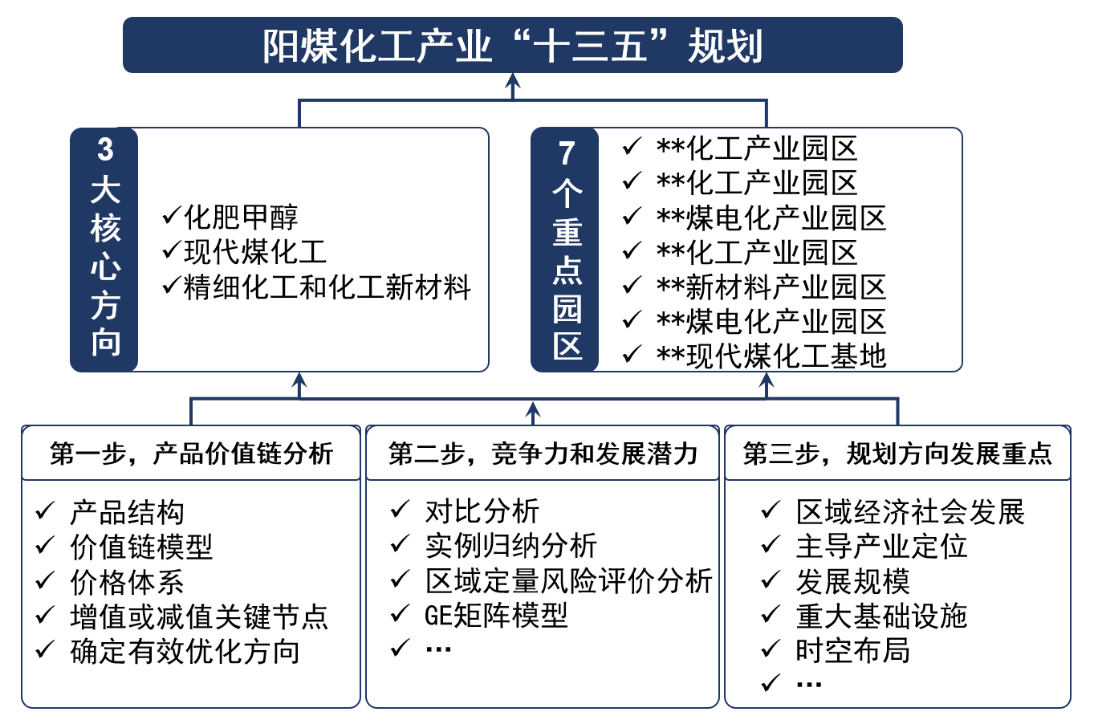阳煤集团化工产业的发展历程是我国传统煤化工的典型代表,既有复杂历史又有新增内容,导致形成新老并存、良莠不齐的现状。针对研究对象的复杂性,本项目采取了“把脉问诊解难题,量体裁衣定规划”的方法,采用10+1工作方案,选取阳煤化工3大核心产业和7个重点园区进行评价诊断,共计10个专项诊断研究,在此基础上形成阳煤化工产业“十三五”规划,由此形成切合实际的诊断和规划研究。