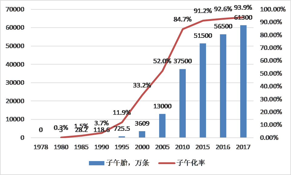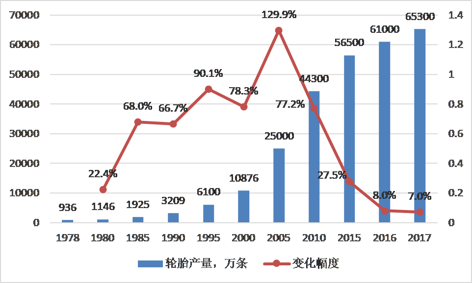 经过四十年的发展,国内轮胎行业规模获得了巨大增长。2017年国内轮胎产量6.53亿条,与1978年的不到1000万条相比,增长了近69倍(见下图)。