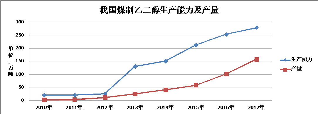 在国家的大力支持、科研人员开拓进取、生产企业的不懈努力下,我国成为全球唯一将煤制乙二醇工业化的国家。截止2017年底,我国煤制乙二醇生产能力达到278万t/a,产量156万t,分别占国内乙二醇总生产能力的31.7%,产量的27.4%。下图显示我国煤制乙二醇由工业化初始到2017年的生产能力和产量变化情况。