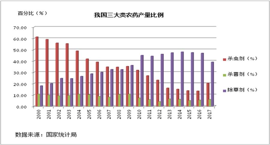 2010年,我国农药总产量中除草剂、杀虫剂和杀菌剂的比例分别为18.0%、61.3%和10.6%。到2017年农药总产量中除草剂、杀虫剂和杀菌剂的比例分别为39.0%、20.3%和5.8%。这些年,我国农药品种呈现除草剂产量逐年上升,杀菌剂产量平稳,杀虫剂产量逐年下降的格局,这显示出我国农药种类结构逐步趋向合理,农药品种结构也得到明显改善。