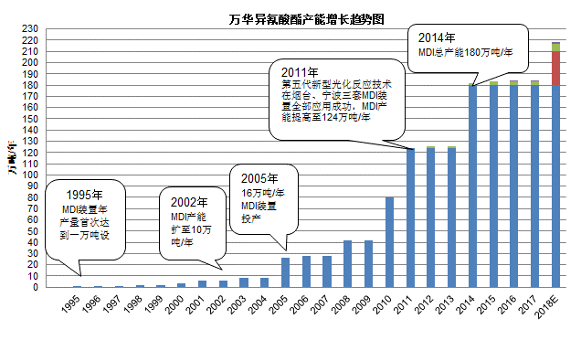烟台万华与青岛化工学院联合进行MDI制造技术的攻关,相继开发成功1.5万吨/年、2万吨/年和4万吨/年的MDI制造技术,并掌握了8万吨/年以上的MDI核心制造技术,解决了MDI生产过程中的缩合反应、光气化反应和分离精制三大核心技术难题,使中国成为继德、美、英、日之后全球第5个拥有MDI制造技术自主知识产权的国家。2002年底,烟台万华MDI生产规模达到10万吨/年。2003年8月,烟台万华16万吨/年MDI工程项目建设在宁波大榭正式开始,成为我国聚氨酯工业发展史上重要的里程碑。2005年11月,烟台万华16万吨/年MDI工程项目顺利建成投产,显著提升了我国异氰酸酯生产技术水平和国际竞争能力。