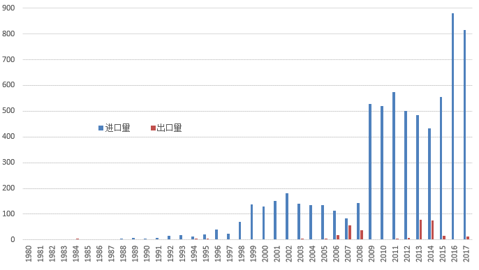 1998年以前中国甲醇每年的进口量都不到30万吨,这个阶段的中国市场供应还是以国产的货物为主。1999年到2008年期间中国甲醇年进口数量基本维持在100到200万吨之间,国内自给率由1999年的历史最低57%上升至2007年的历史最高97%。但是2008年下半年金融危机以来,大量的中东甲醇以它比较低廉的成本优势进入到中国,并将中国作为主要的销售市场,导致2009年开始中国甲醇进口数量猛增至五百多万吨。2016年美国甲醇开始对中国输出,2017年进口规模超过800万吨。