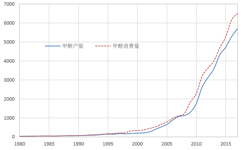 我国甲醇生产起始于20世纪50年代末期,发展了有中国特色的合成氨联产甲醇的生产技术,依附于中、小型氨厂,规模很小。改革开放前,中国的甲醇年产量仅20万吨。随后开始出现了独立甲醇项目的建设,同时在中型、大型氮肥厂的建设的带动下,联产甲醇规模有所上升,但总体增长非常缓慢。进入21世纪以来,独立甲醇的大型化和规模化推广,使得甲醇产业步入快速发展的轨道,生产规模和技术水平都有大幅提高,至2017年产量达到5700万吨。目前中国已经成为国际市场最主要的甲醇生产国和消费国。改革开放以来的甲醇产量和消费量逐年变化情况如下图。