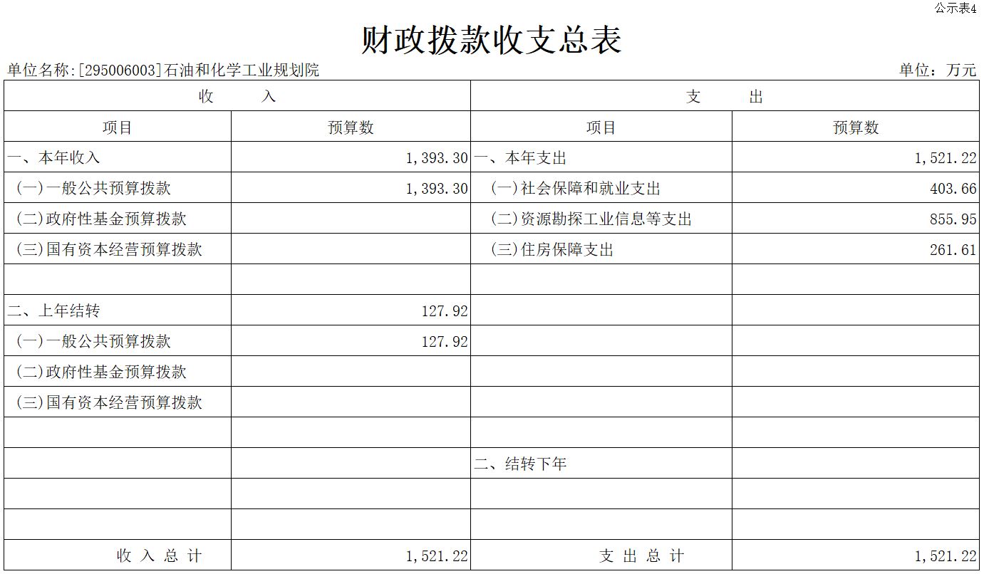 2022年财政拨款收支总预算1521.22万元。收入包括:一般公共预算财政拨款1393.30万元、上年结转127.92万元;支出包括:社会保障和就业支出403.66万元、资源勘探工业信息等支出855.95万元、住房保障支出261.61万元。