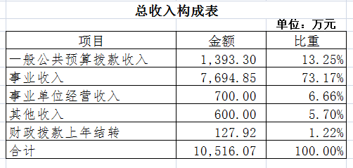 2022年收入预算10516.07万元,其中上年结转127.92万元,占1.22%;一般公共预算拨款收入1393.30万元,占13.25%;事业收入7694.85万元,占73.17%;事业单位经营收入700万元,占6.66%;其他收入600万元,占5.70%。