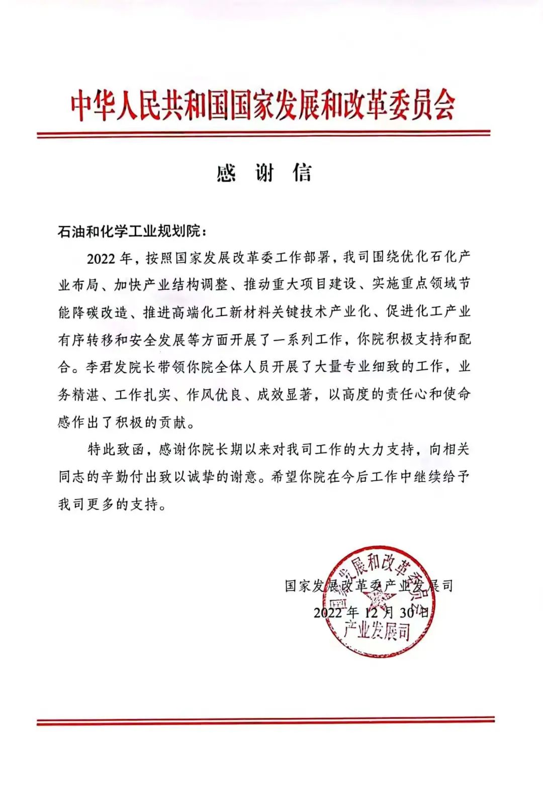 2022年是实施“十四五”规划的关键之年,我们国家已经迈入一个新时代、新征程,面对新任务、新机遇、新挑战,奋进正当时。辞旧迎新之际,国家发展和改革委员会产业发展司发来感谢信,感谢一年来澳门新葡京 为产业发展司相关工作开展做出的积极贡献,感谢李君发院长和白雪松、赵彤阳、吴文龙、伍洛同志在相关研究工作中起到的重要作用。