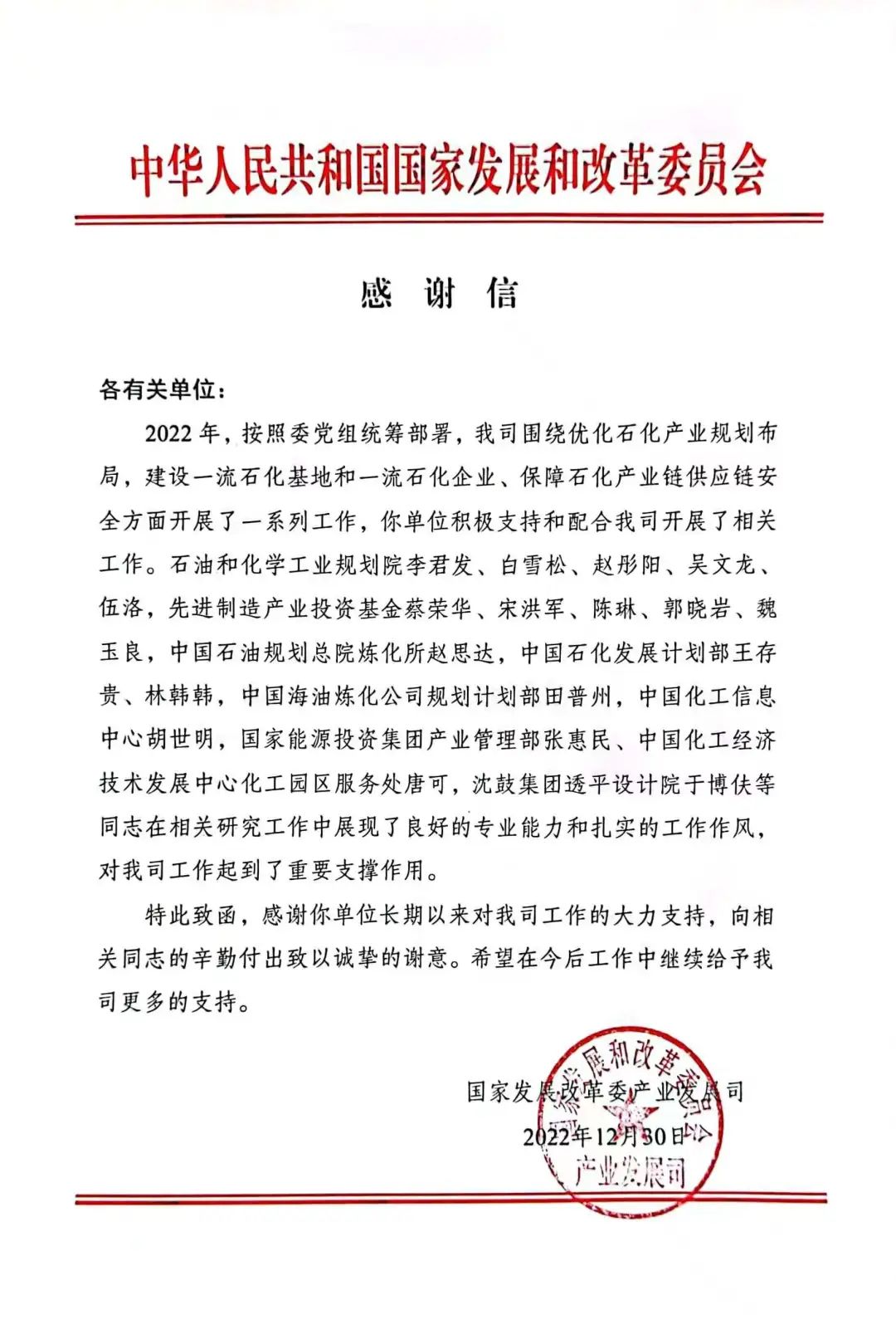 国家发展改革委产业发展司向澳门新葡京 发来感谢信
