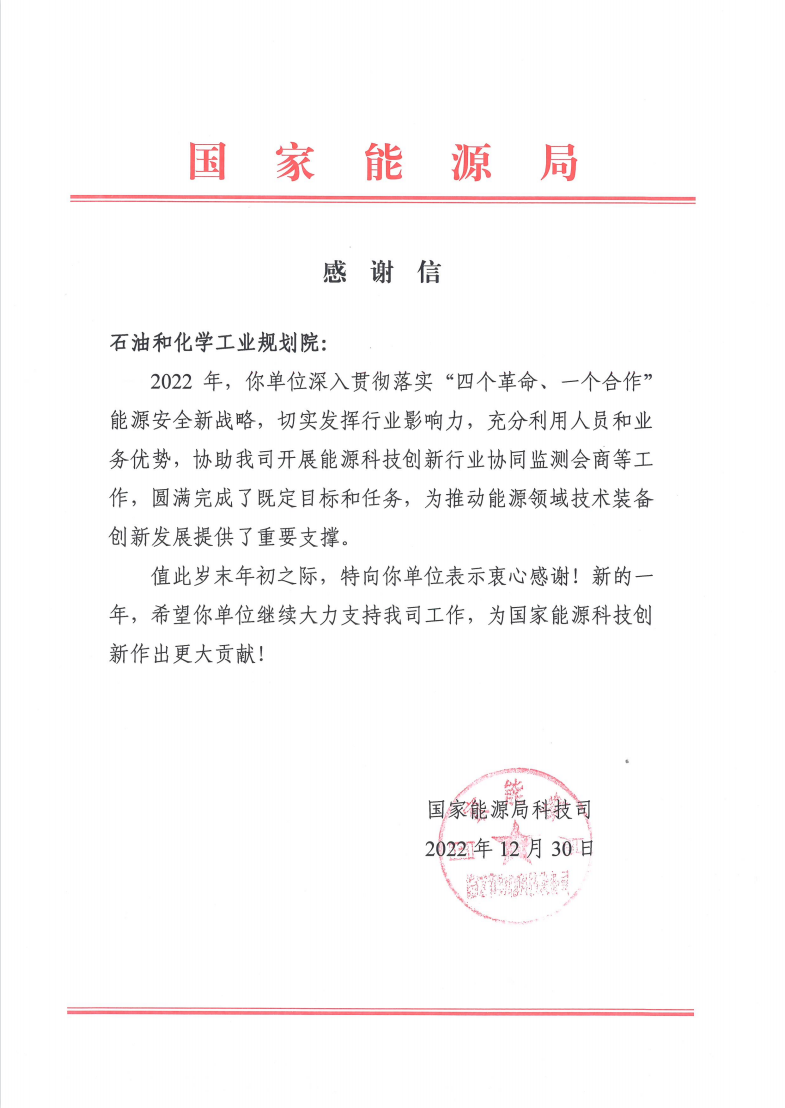 澳门新葡京利用自身专业特长和技术力量,长期在石化化工行业能源监测、煤炭深加工产业发展、能源领域科技创新等方面为国家能源局科技司提供技术支撑,得到高度认可。新年之际,科技司发来感谢信。澳门新葡京将一如既往,做好国家相关部委的参谋,为促进相关行业实现高质量发展做出应有贡献。
