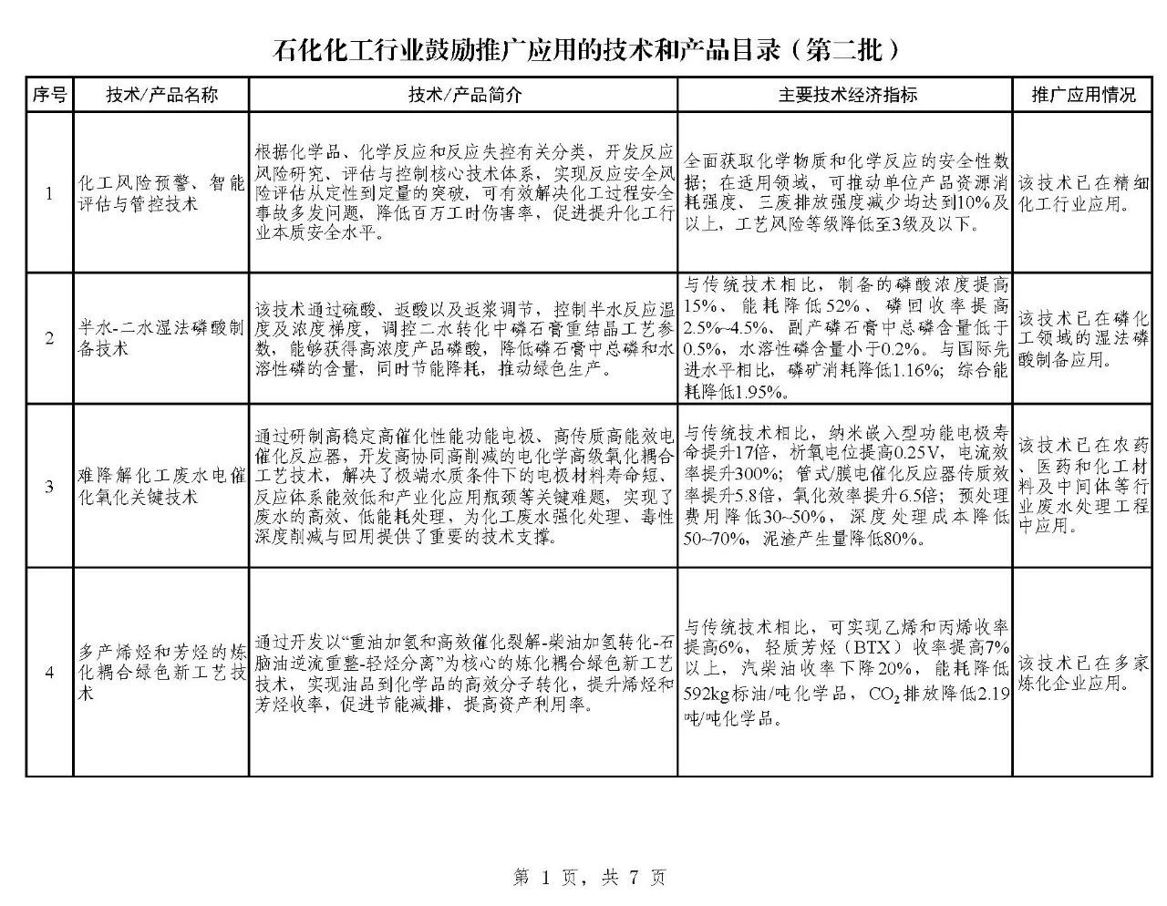 为落实《关于“十四五”推动石化化工行业高质量发展的指导意见》,推动石化化工行业高端化、智能化、绿色化发展,经地方及相关单位推荐、专家评审和对外公示,现将《石化化工行业鼓励推广应用的技术和产品目录(第二批)》予以印发。请各地工业和信息化主管部门加大宣传推广和政策支持力度,推动石化化工行业转型升级。