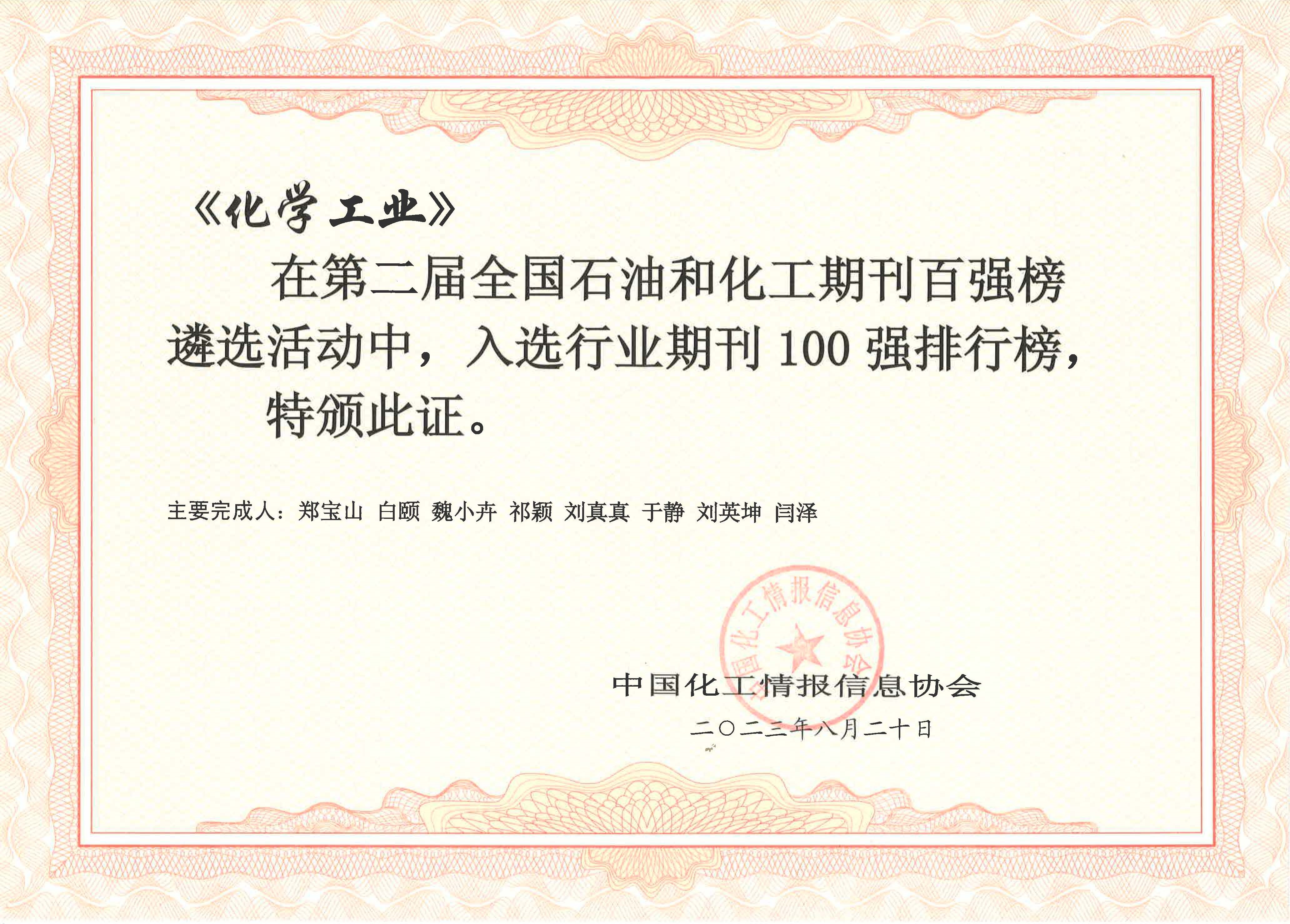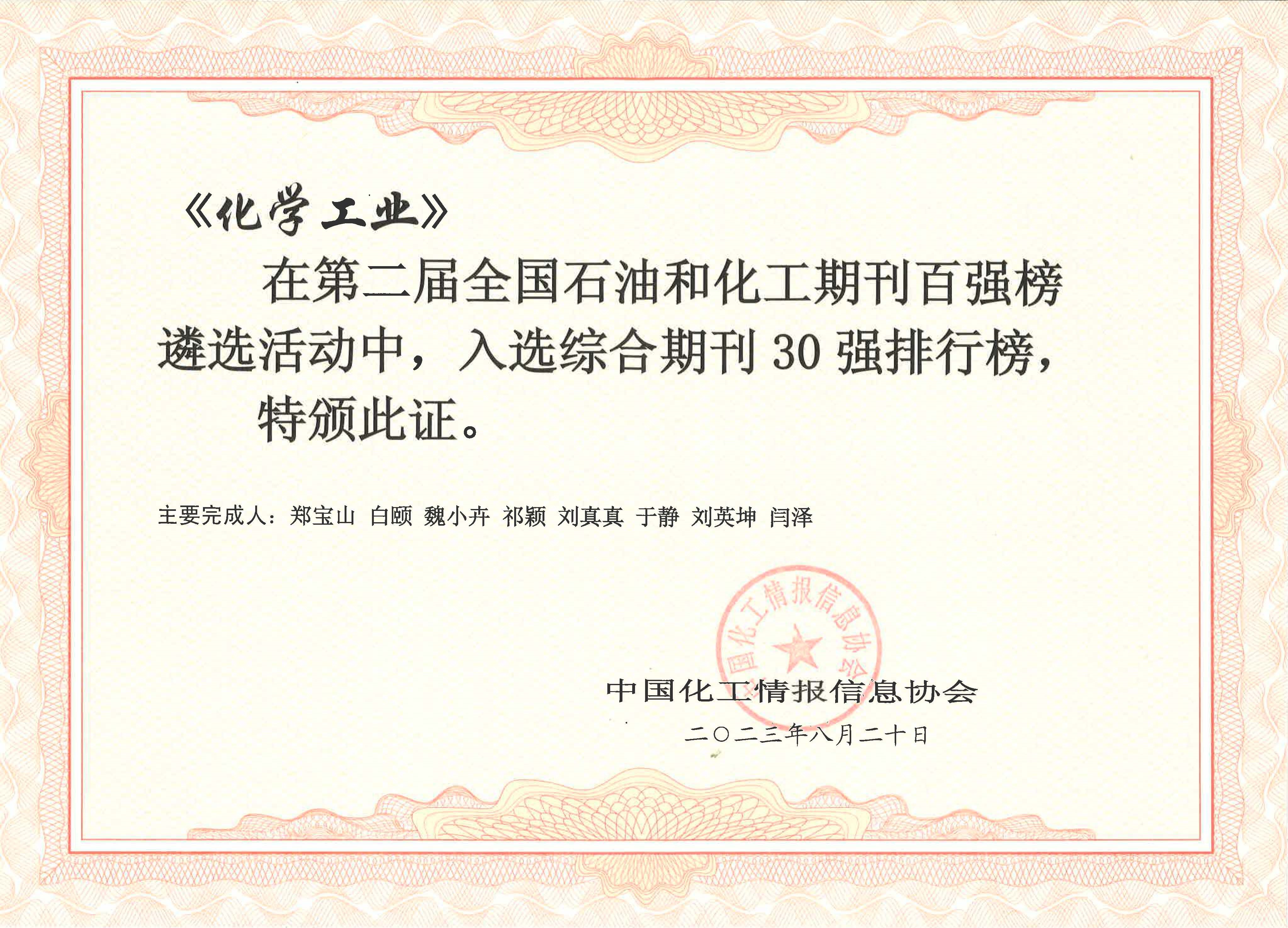 为贯彻落实关于建设世界一流科技期刊的精神,引导澳门新葡京 和化工行业期刊适应媒体数字化、网络化、市场化发展趋势,打造行业领军期刊、品牌期刊,由中国化工情报信息协会与中国化工信息中心、中澳门新葡京 经济技术研究院共同开展的第二届全国澳门新葡京 和化工期刊百强排行榜遴选活动近日在浙江宁波发布。《化学工业》在本次百强榜遴选活动中入选行业期刊100强和综合期刊30强。