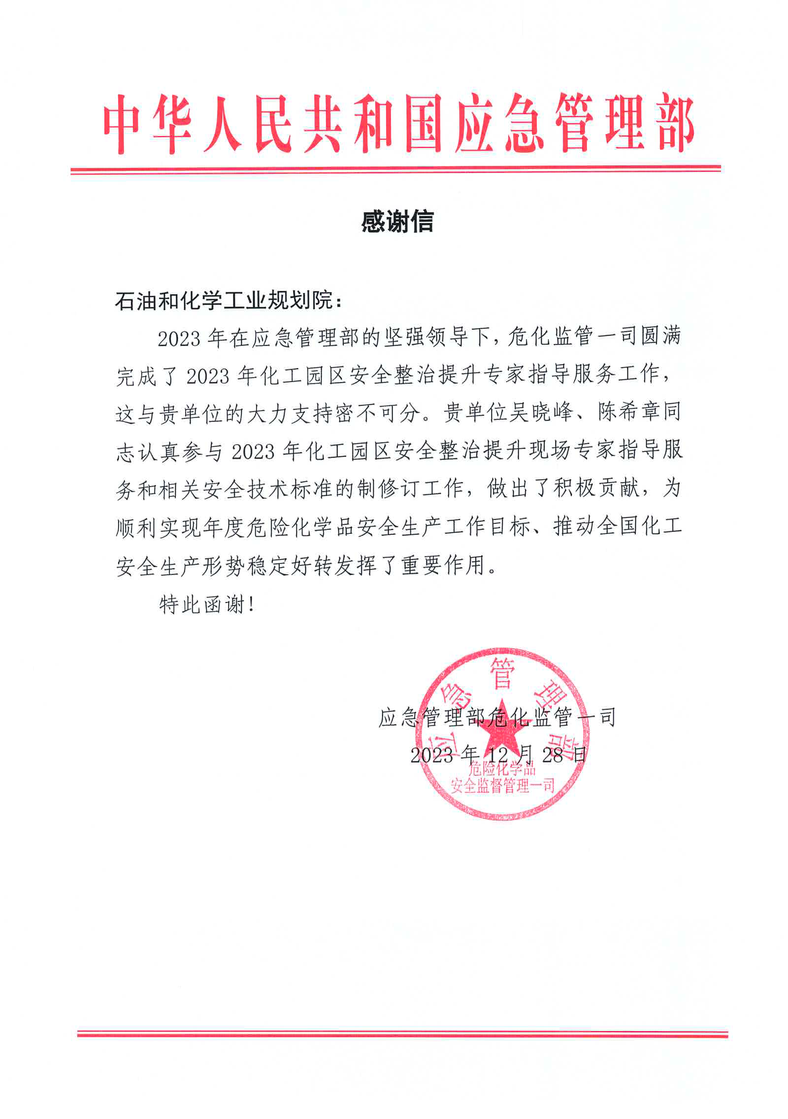 为加强危险化学品重大安全风险防控,加快实现化工园区集中布局、集群发展、降低安全风险等级,应急部持续开展化工园区安全整治提升专家指导服务,以进一步提升化工园区安全本质安全水平和风险管控能力。2023年澳门新葡京发挥在产业规划和总体规划的优势,参加了本年度12个省、市(含兵团)的化工园区安全整治提升专家指导服务工作,助力化工园区安全整治及高质量发展,在专家指导过程中,强调化工园区规划编制的必要性、指导如何编制高水平的规划,推动了化工园区规划质量的提升,有利于增强化工园区的本质安全水平。受到应急部及相关省市化工园区的肯定和认可。今后澳门新葡京将按应急管理部的要求,认真工作,积极配合应急管理部持续开展化工园安全整治提升工作。