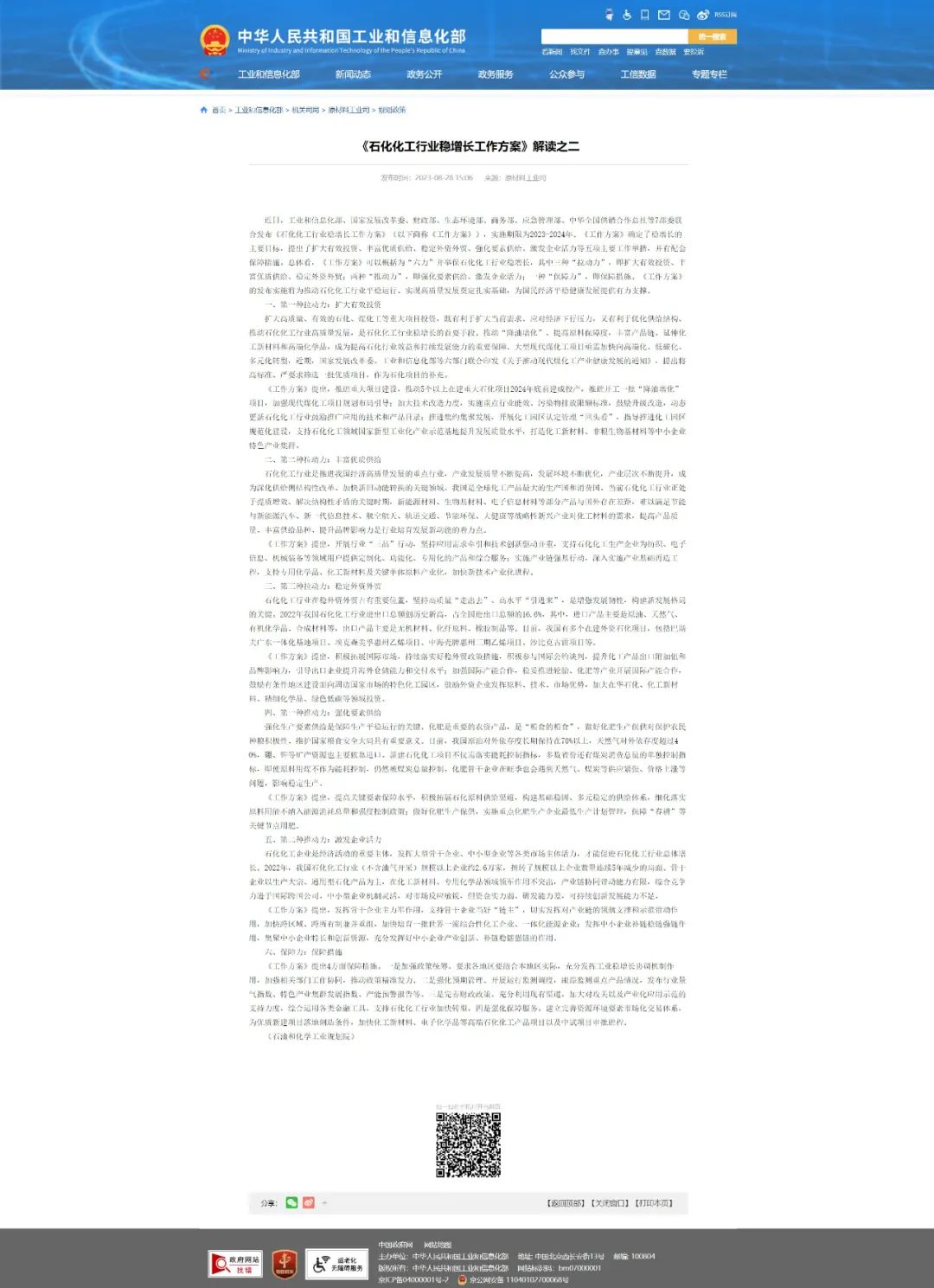 《工作方案》提出,推进重大项目建设,推动5个以上在建重大石化项目2024年底前建成投产,推进开工一批“降油增化”项目,加强现代煤化工项目规划布局引导;加大技术改造力度,实施重点行业能效、污染物排放限额标准,鼓励升级改造,动态更新石化化工行业鼓励推广应用的技术和产品目录;推进集约集聚发展,开展化工园区认定管理“回头看”,指导推进化工园区规范化建设,支持石化化工领域国家新型工业化产业示范基地提升发展质量水平,打造化工新材料、非粮生物基材料等中小企业特色产业集群。