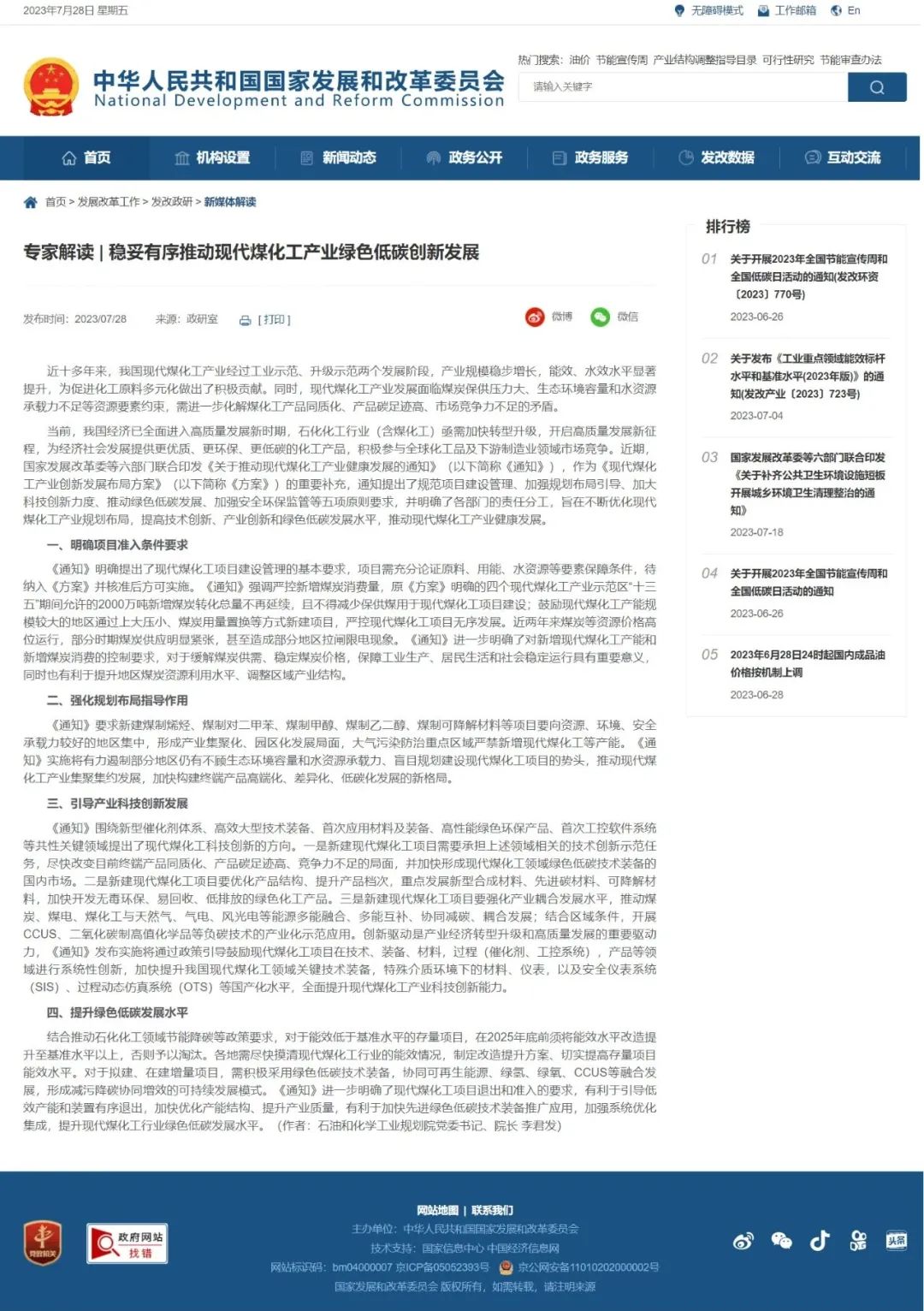 7月27日,国家发改委网站发布《国家发改委等部门关于推动现代煤化工产业健康发展的通知》。28日,发表李君发院长的解读文章《稳妥有序推动现代煤化工产业绿色低碳创新发展》。