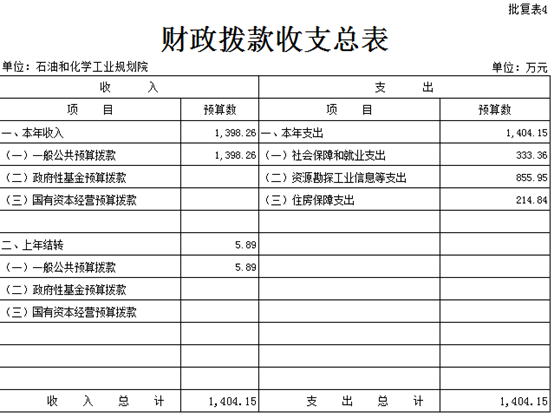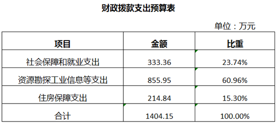 2024年财政拨款收支总预算1404.15万元。收入包括:一般公共预算拨款1398.26万元、上年结转5.89万元;支出包括:社会保障和就业支出333.36万元、资源勘探工业信息等支出855.95万元、住房保障支出214.84万元。