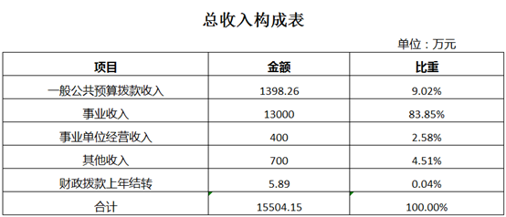 2024年收入预算15504.15万元,其中上年结转5.89万元,占0.04%;一般公共预算拨款收入1398.26万元,占9.02%;事业收入13000万元,占83.85%;事业单位经营收入400万元,占2.58%;其他收入700万元,占4.51%。