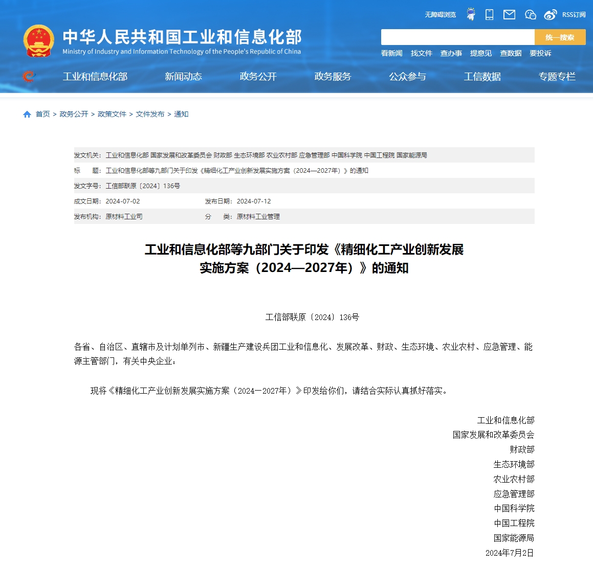 为贯彻国家有关规划重点任务,引导精细化工产业高端化、绿色化、智能化发展,近日,工业和信息化部、国家发展改革委、财政部、生态环境部、农业农村部、应急管理部、中国科学院、中国工程院、国家能源局等9部门联合发布《精细化工产业创新发展实施方案(2024—2027年)》(以下简称《实施方案》)。