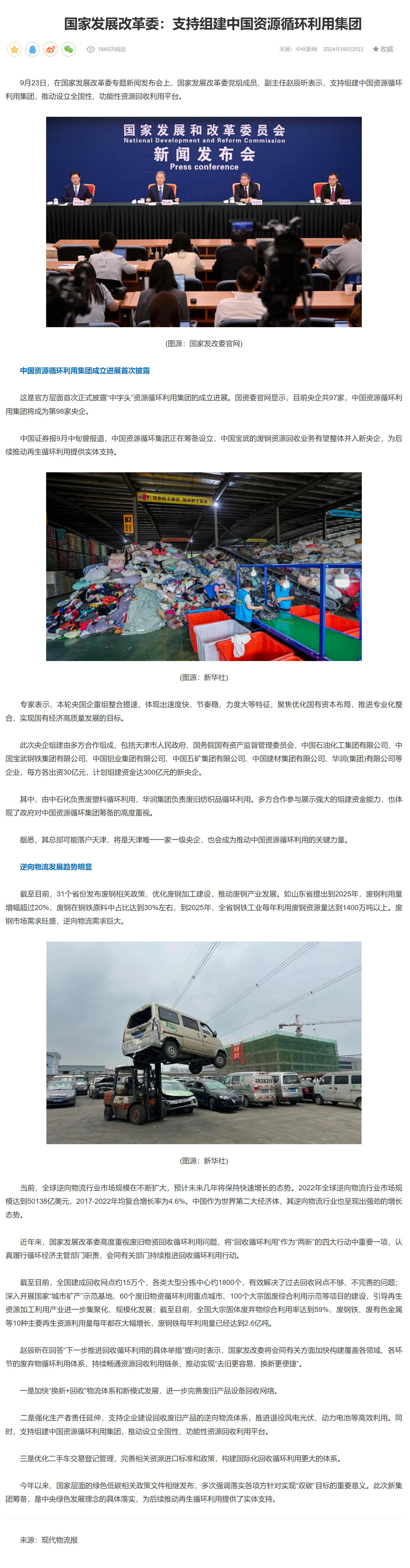 > 国家发展改革委:支持组建中国资源循环利用集团