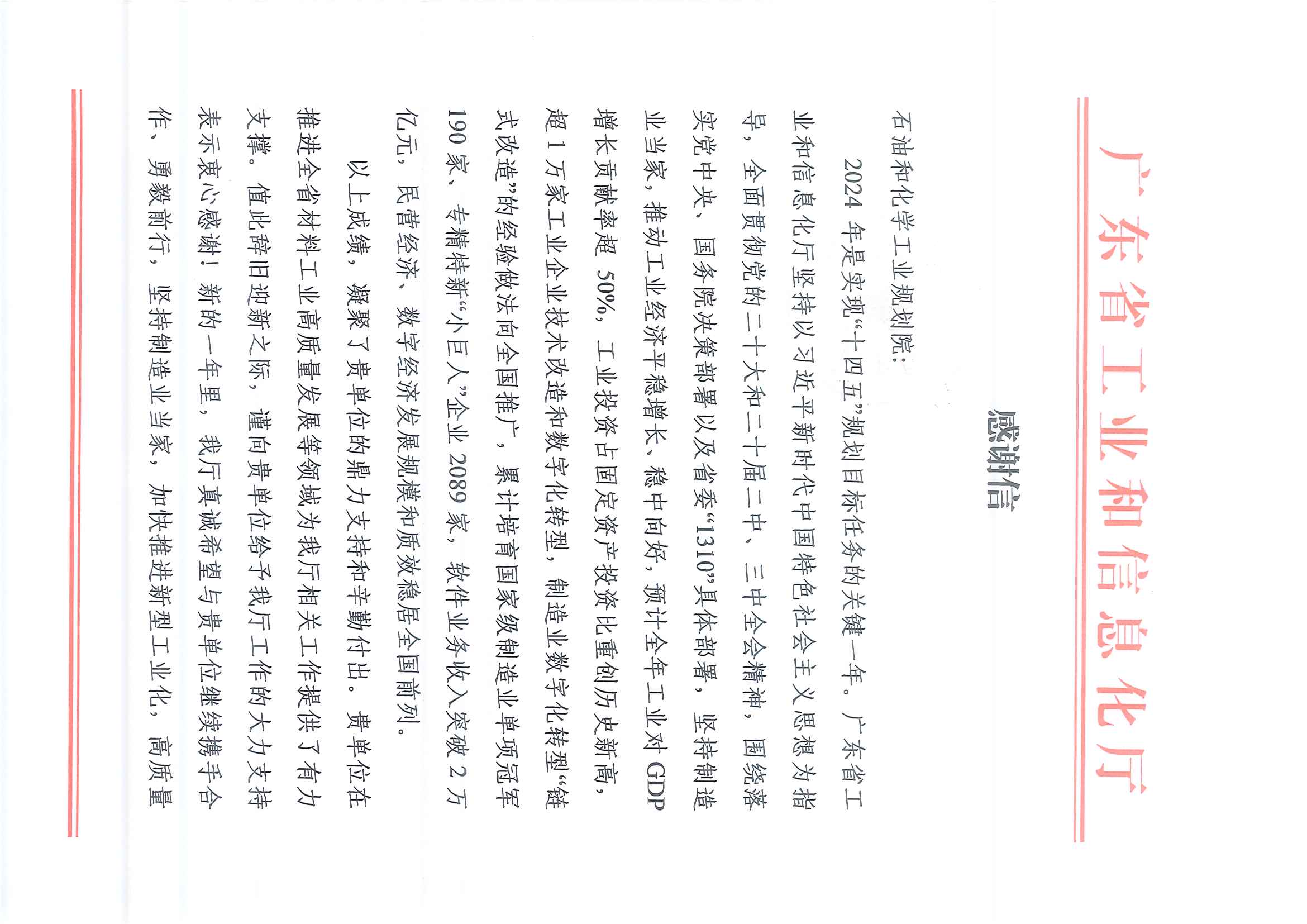 2024年,澳门新葡京 积极发挥行业智库的作用,支撑广东省工业和信息化厅在绿色石化产业高质量发展、化工新材料产业创新发展、中试基地建设等方面开展了一系列工作,获得了广东省工业和信息化厅的高度认可。
