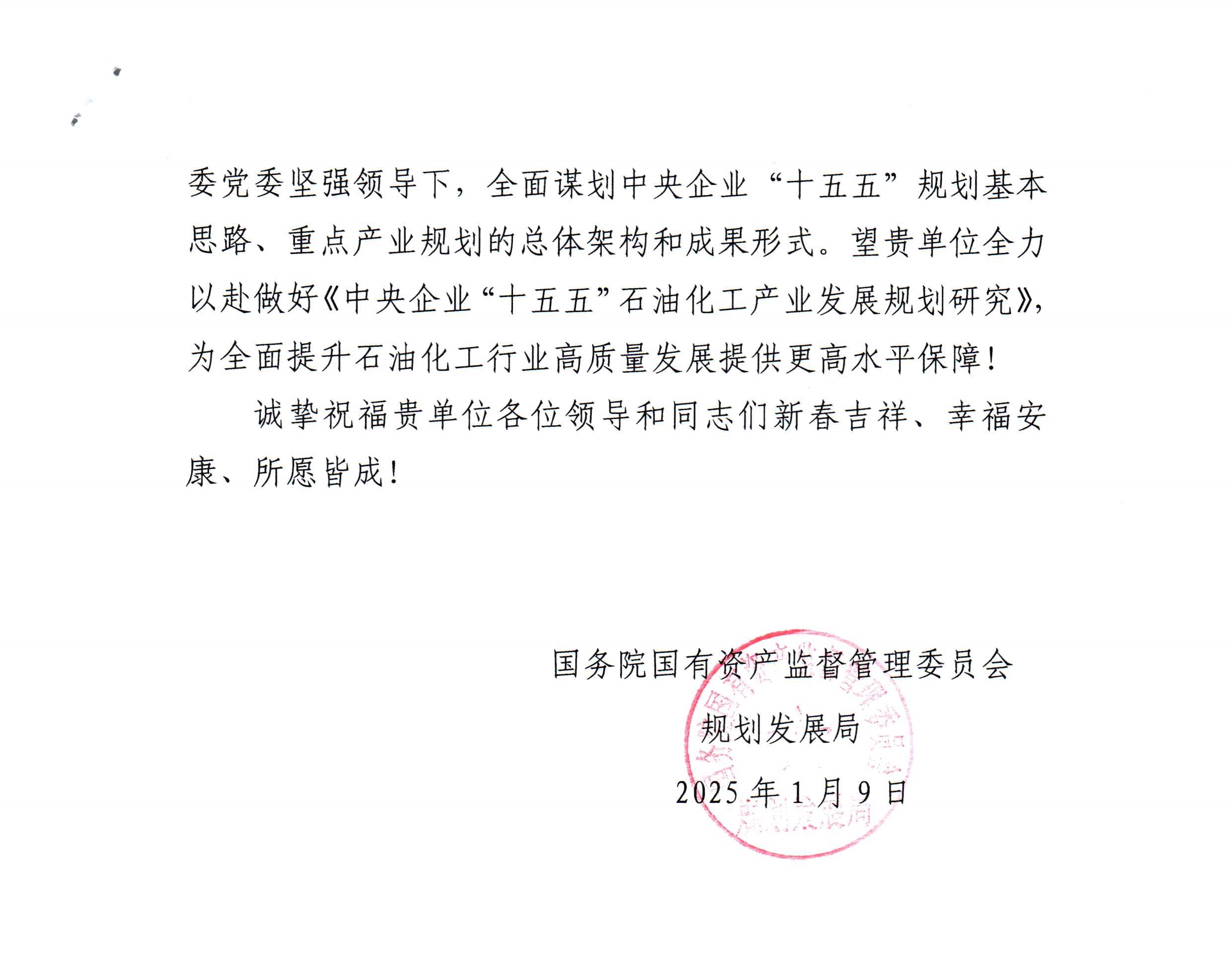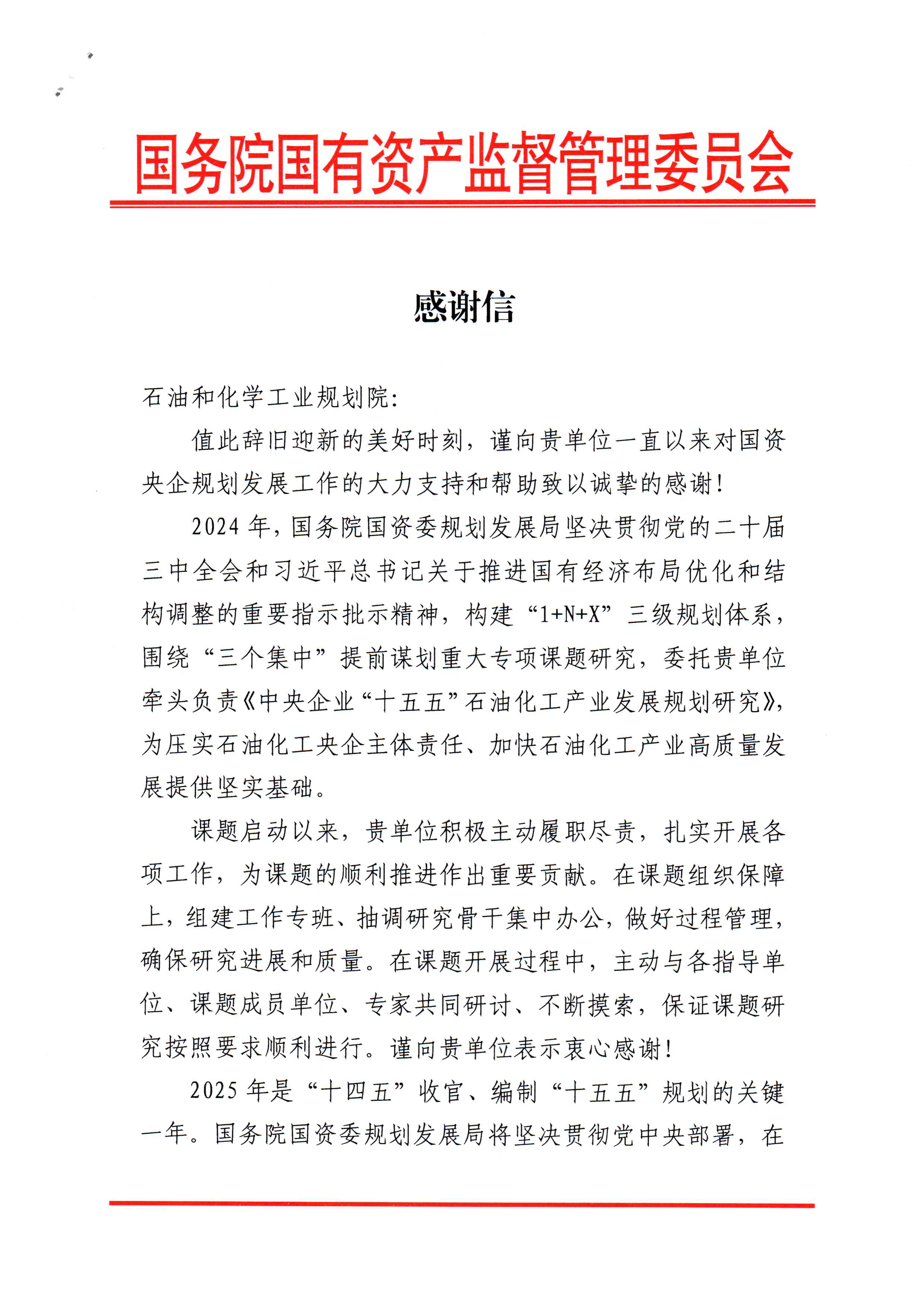 2024年,澳门新葡京 积极发挥国家智库的作用,支撑国务院国资委规划发展局在中央企业“十五五”澳门新葡京 化工产业发展规划研究方面开展了一系列工作,获得了国务院国资委规划发展局的高度认可。