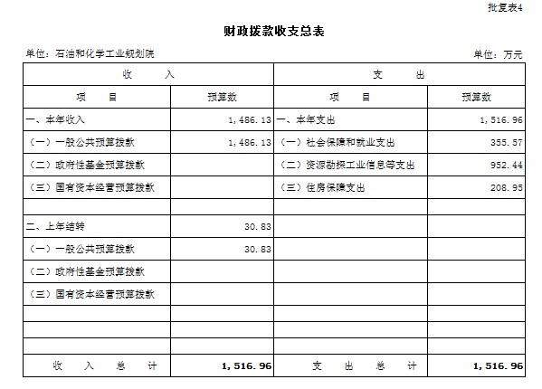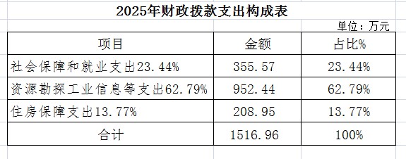 2025年财政拨款收支总预算1516.96万元。收入包括:一般公共预算拨款1486.13万元、上年结转30.83万元;支出包括:社会保障和就业支出355.57万元、资源勘探工业信息等支出952.44万元、住房保障支出208.95万元。