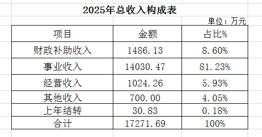 2025年收入预算17271.69万元,其中:一般公共预算上年结转30.83万元,占0.18%;一般公共预算拨款收入1486.13万元,占8.60%;事业收入14030.47万元,占81.23%;事业单位经营收入1024.26万元,占5.93%;其他收入700.00万元,占4.05%。