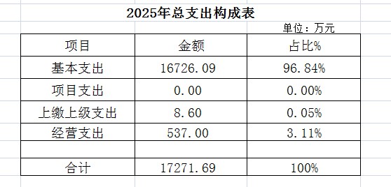 2025年支出预算17271.69万元,其中:基本支出16726.09万元,占96.84%;事业单位经营支出537.00万元,占3.11%;上缴上级支出8.60万元,占0.05%。