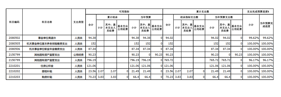如上图所示,我单位2024年度预算执行进度为97.85%,情况良好。除“离退休费(完成率99.62%)”和“其他国有资产监管支出-人员类(完成率96.17%)”两个项目,因年末新增追加投资已无法按时支付外,原预算计划完成率为100%。