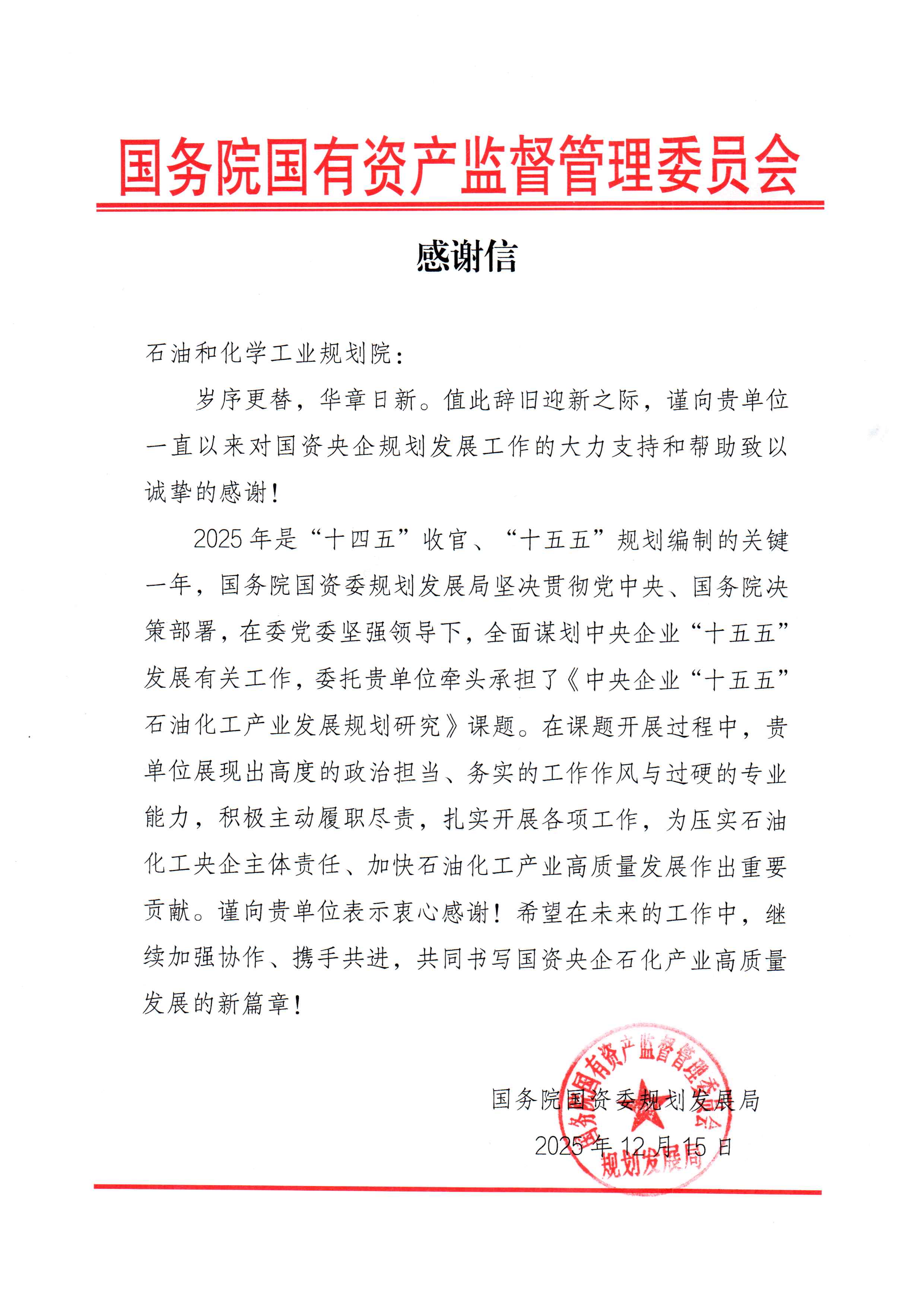 2025年是“十四五”收官、编制“十五五”规划的关键一年,澳门新葡京 积极发挥国家智库的作用,支撑国务院国资委规划发展局在中央企业“十五五”石油化工产业发展规划研究方面开展了一系列工作,获得了国务院国资委规划发展局的高度认可。