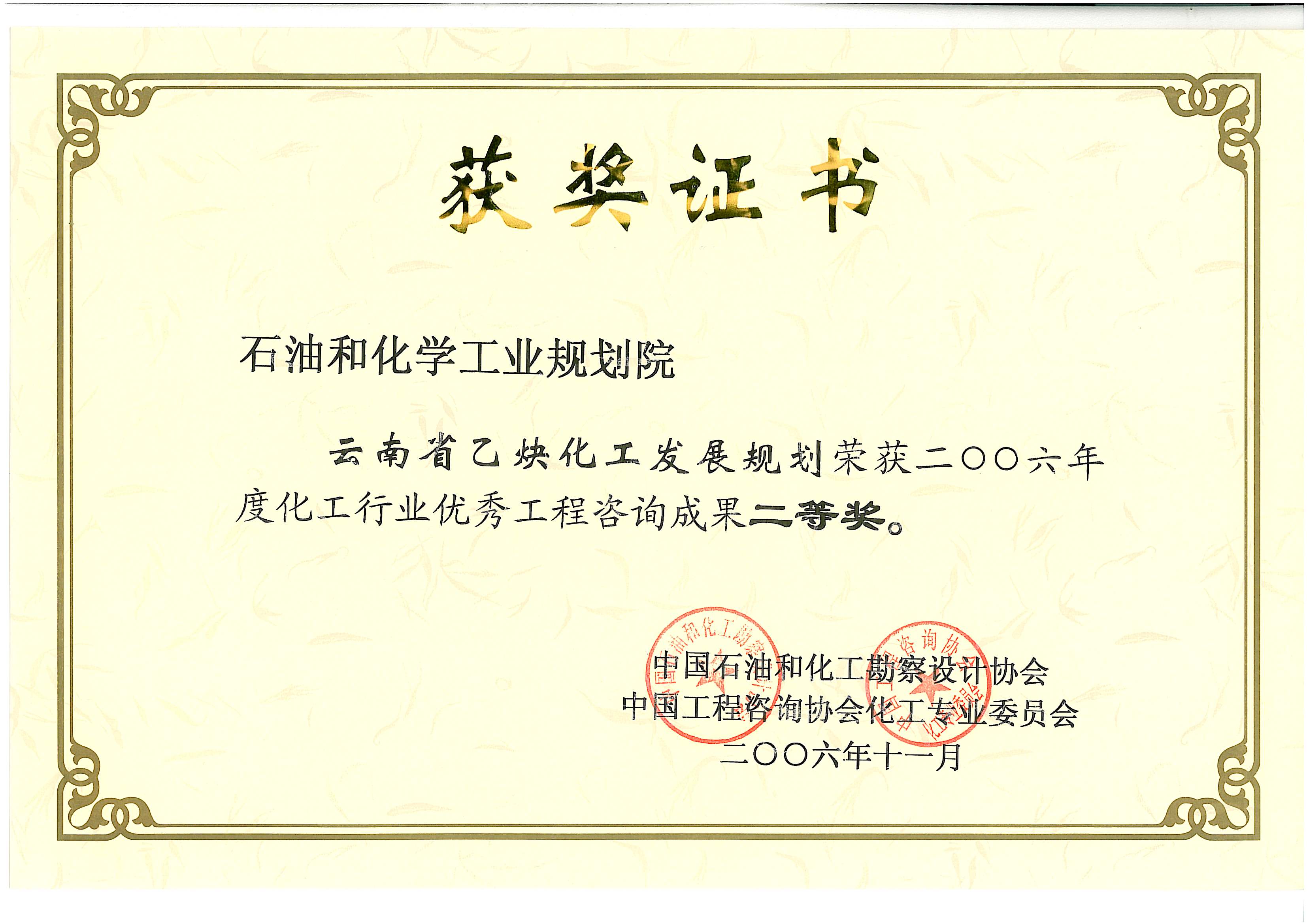 化工行业优秀工程咨询成果二等奖(云南乙炔)
