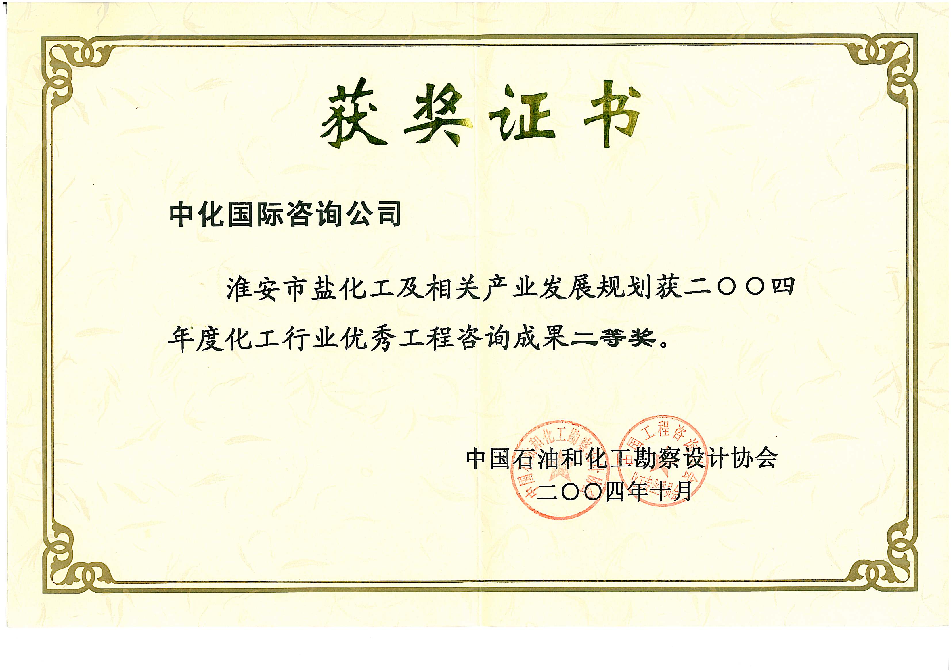 化工行业优秀工程咨询成果二等奖(淮安规划)