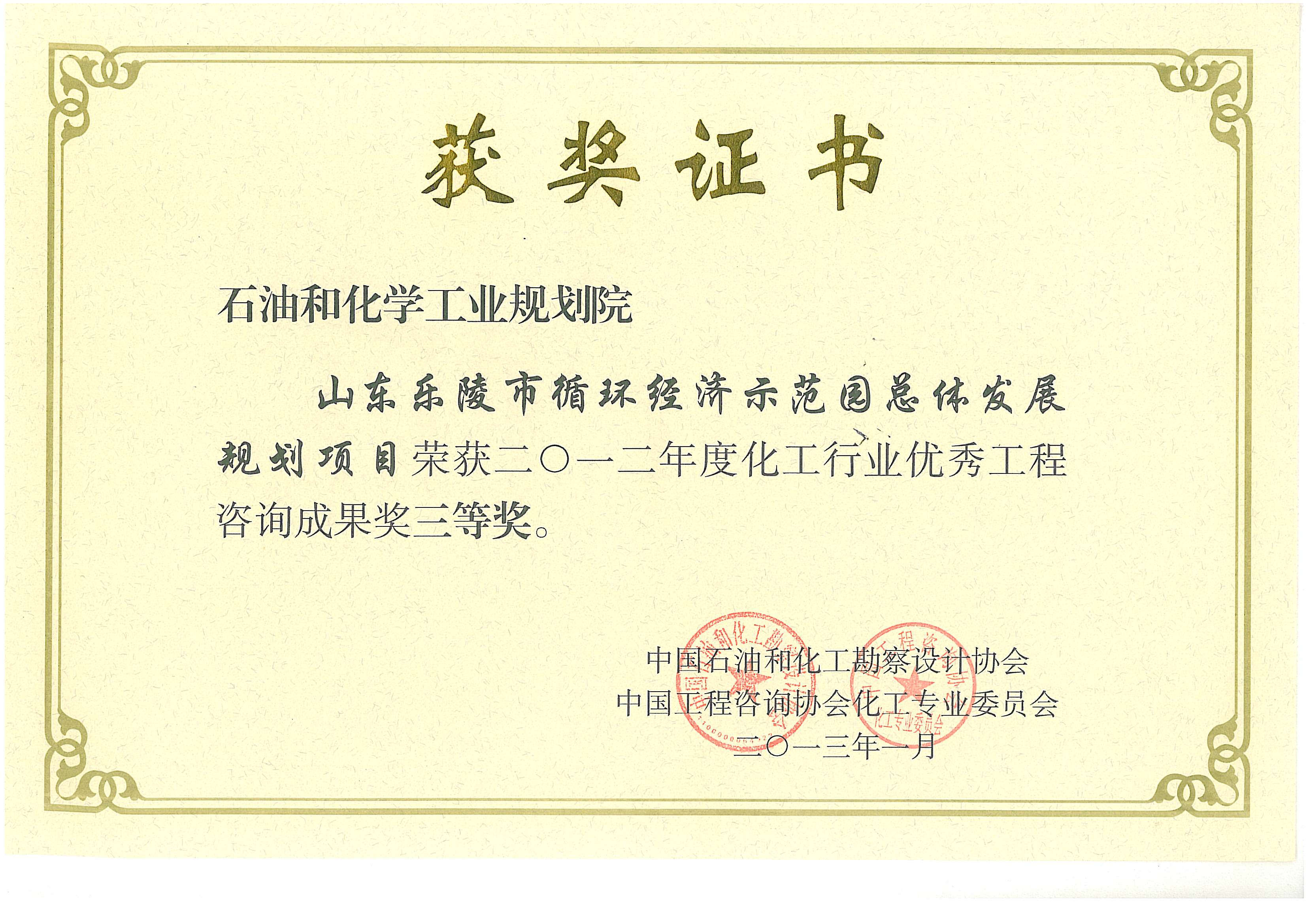化工行业优秀工程咨询成果三等奖(乐陵)
