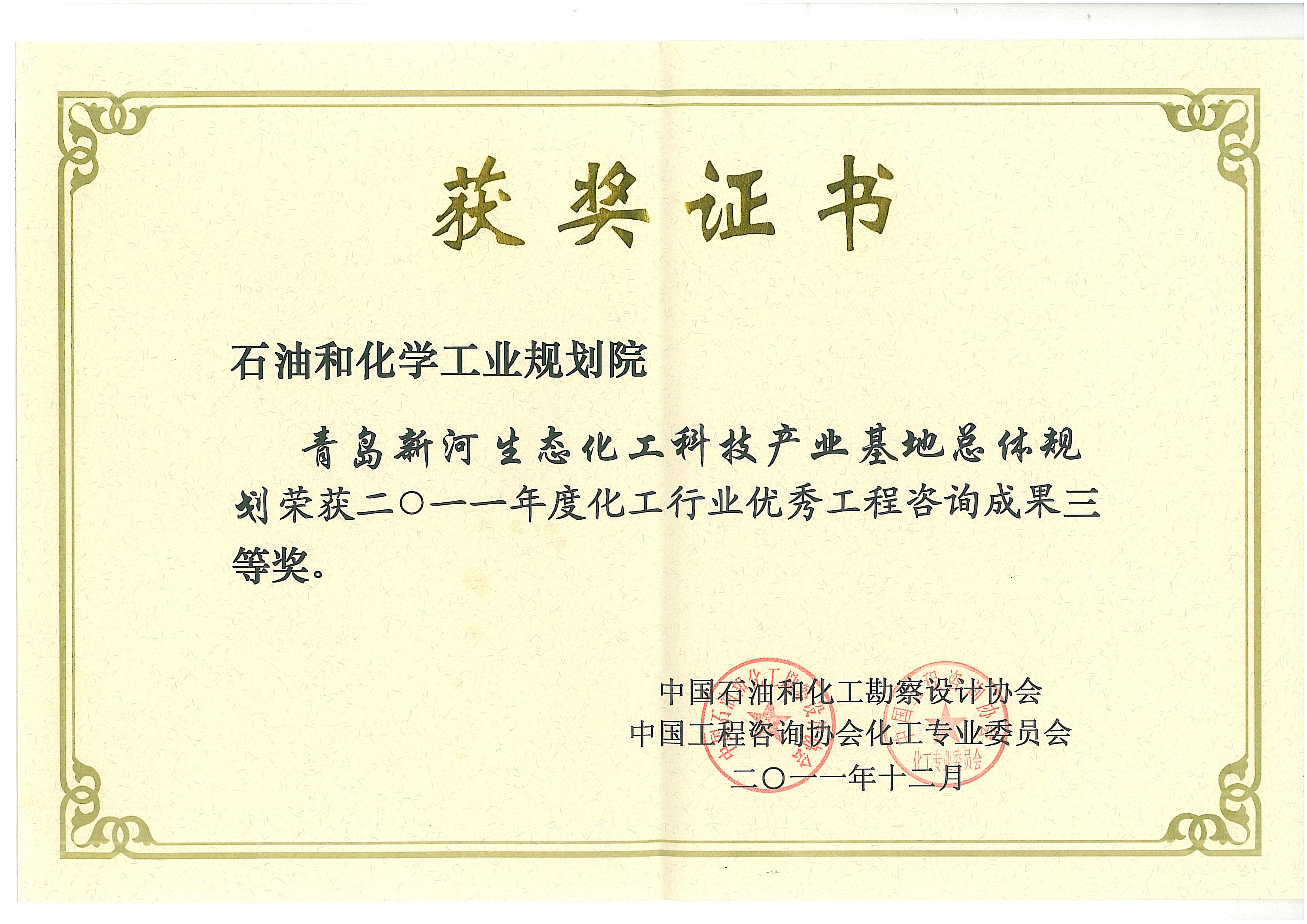 化工行业优秀工程咨询成果三等奖(青岛新河)