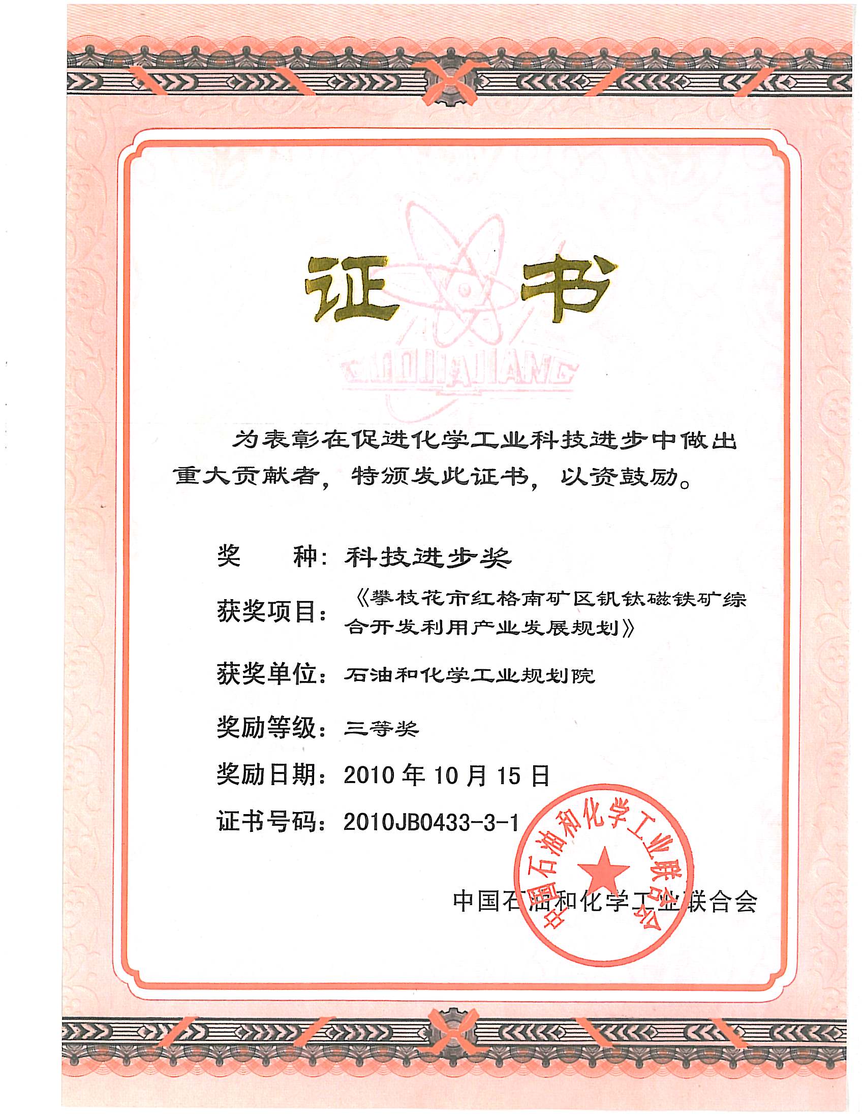 科技进步三等奖(攀支花)