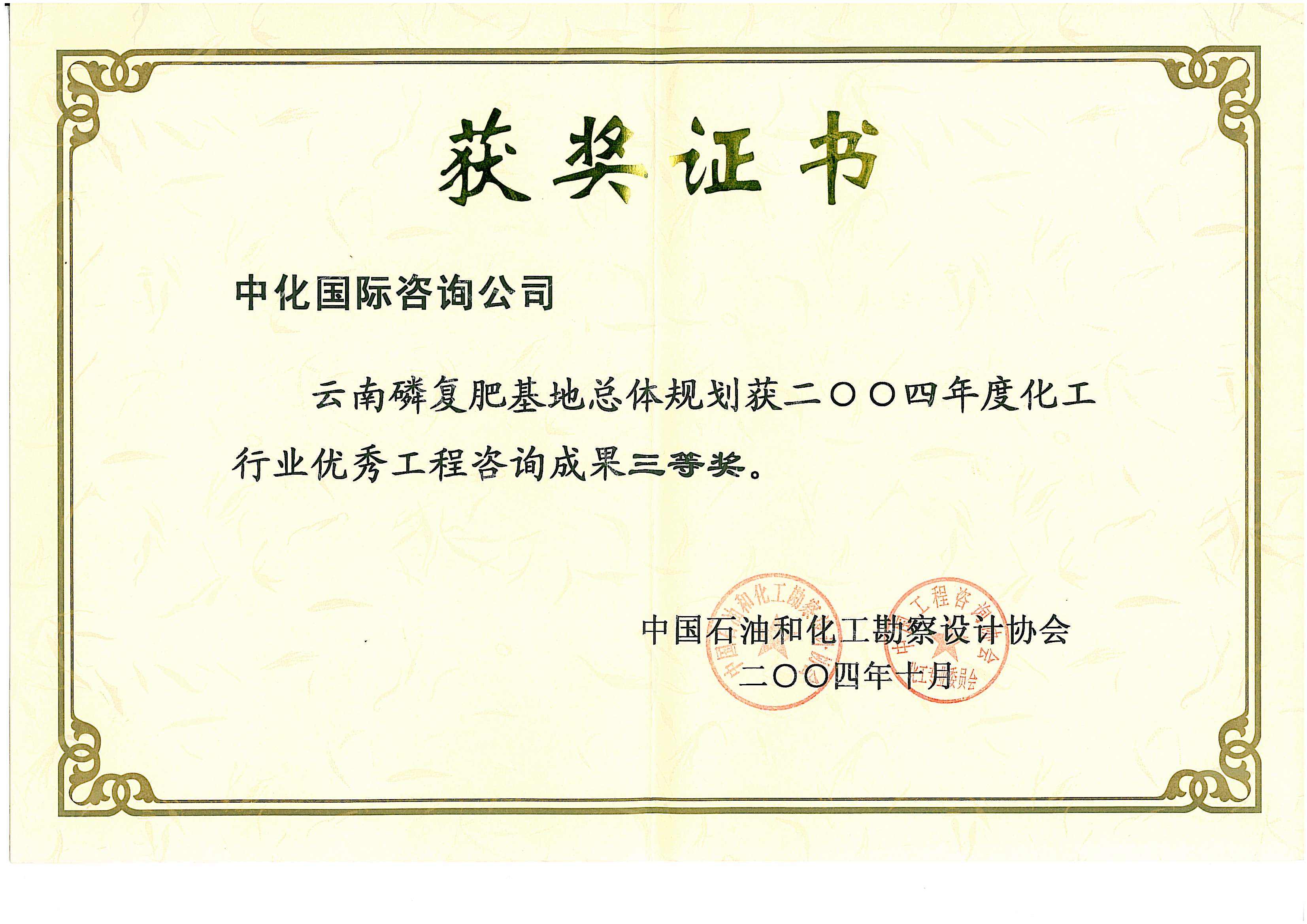 化工行业优秀工程咨询成果三等奖(云南磷复肥)